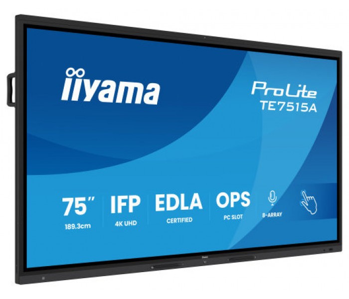 iiyama TE7515A-B1AG. Diseño de producto: Panel plano interactivo. Diagonal de la pantalla: 189,2 cm (74.5"), Resolución de la pantalla: 3840 x 2160 Pixeles, Brillo de pantalla: 550 cd / m², Tipo HD: 4K Ultra HD, Pantalla táctil. Wifi. Sistema operativo instalado: Android. Color del producto: Negro