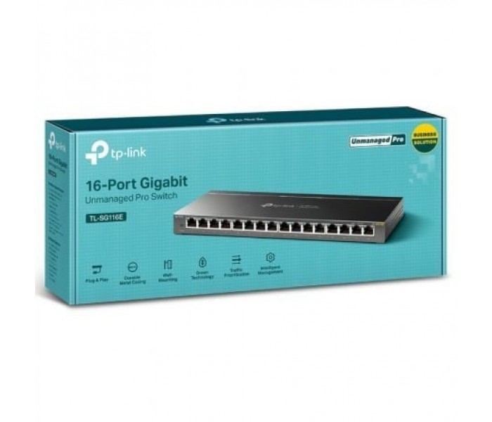 HARDWARE FEATURES Standards and Protocols IEEE 802.3i, IEEE 802.3u, IEEE 802.3ab, IEEE 802.3x, IEEE 802.1q, IEEE 802.1p Interface 16 10/100/1000Mbps RJ45 Ports AUTO Negotiation/AUTO MDI/MDIX Network Media 10BASE-T: UTP category 3, 4, 5 cable (maximum 100m) EIA/TIA-568 100O STP (maximum 100m) 100BASE-TX: UTP category 5, 5e cable (maximum 100m) EIA/TIA-568 100O STP (maximum 100m) 1000BASE-T: UTP category 5, 5e, 6 or above cable (maximum 100m) EIA/TIA-568 100O STP (maximum 100m) Fan Quantity Fanless Power Supply External Power Adapter(Output: 9VDC/0.6A) Power Consumption Maximum: 9.3 W Dimensions ( W x D x H ) 11.3 x 4.4 x 1.0 in. (286*111.7*25.4 mm) Max Power Consumption 9.19W(220V/50Hz) Max Heat Dissipation 31.36BTU/h PERFORMANCE Switching Capacity 32Gbps Packet Forwarding Rate 23.81Mpps MAC Address Table 8K Packet Buffer Memory 4.1Mb Jumbo Frame 9KB SOFTWARE FEATURES Quality of Service Support Port-based/802.1p/DSCP priority Support 4 priority queues Rate Limit Storm Control L2 Features IGMP Snooping V1/V2/V3 Static Link Aggregation Port Mirroring Cable Diagnostics Loop Prevention VLAN Supports up to 32 VLANs simultaneously (out of 4K VLAN IDs) MTU/Port/Tag VLAN Transmission Method Store-And-Forward OTHERS Certification FCC, RoHS Package Contents TL-SG116E Power Cord Installation Guide Rubber Feet System Requirements Microsoft® Windows® for running Utility Environment Operating Temperature: 0?~40? (32?~104?) Storage Temperature: -40?~70? (-40?~158?) Operating Humidity: 10%~90% non-condensing Storage Humidity: 5%~90% non-condensing