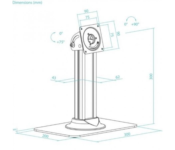 Compatible con VESA: 75x75Peso máximo soportado: 3 KgÁngulo de inclinación: 0°/+75°Ángulo de rotación: 0°/+90°Altura del soporte: 296 mmMedidas de la peana: 300x200 mmSistema de ocultación de cablesAlmohadillas de silicona en la baseColor: NegroMaterial: fabricado en acero de alta calidadPeso neto: 3,16 Kg. Peso bruto: 3,67 kgMedidas del embalaje: 365x213x85 mm