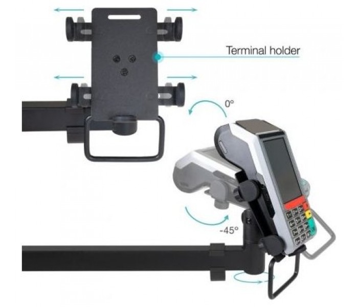 - Permite la instalación de 2 pantallas, una impresora con lector, un terminal y una bandeja para teclado